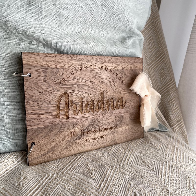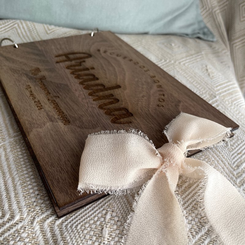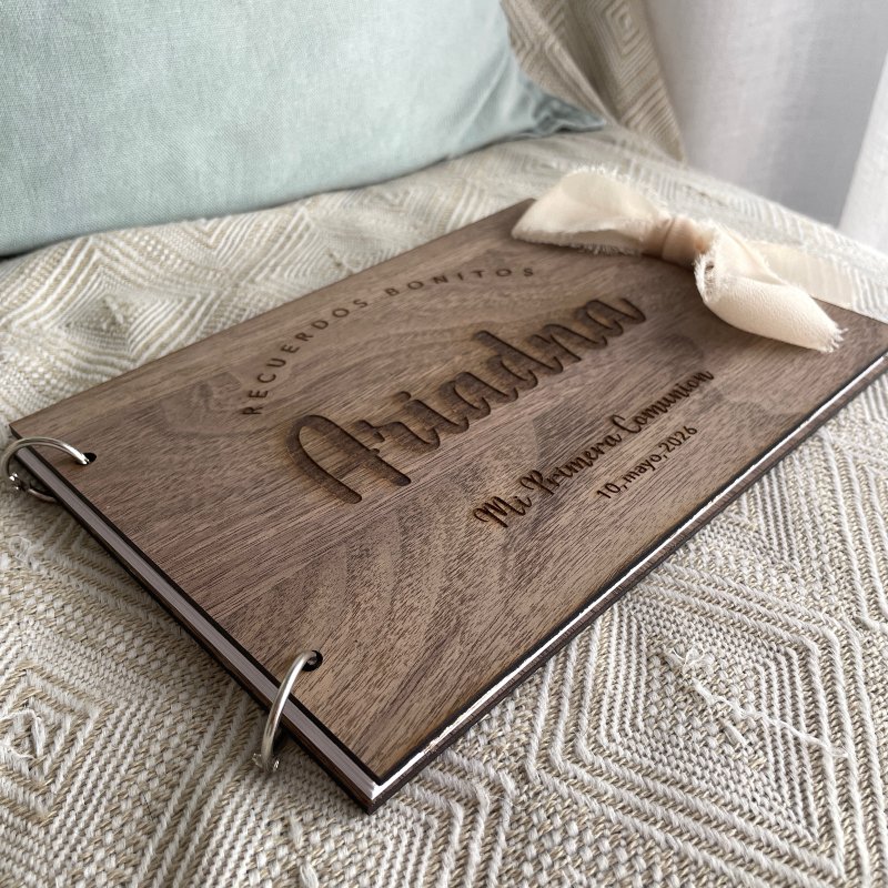 Libro de firmas personalizado para su día especial. Grabado en madera de nogal. Las hojas son de papel grueso blanco, ideal para firmas (no traspasa la tinta) y pegar fotos de recuerdo.