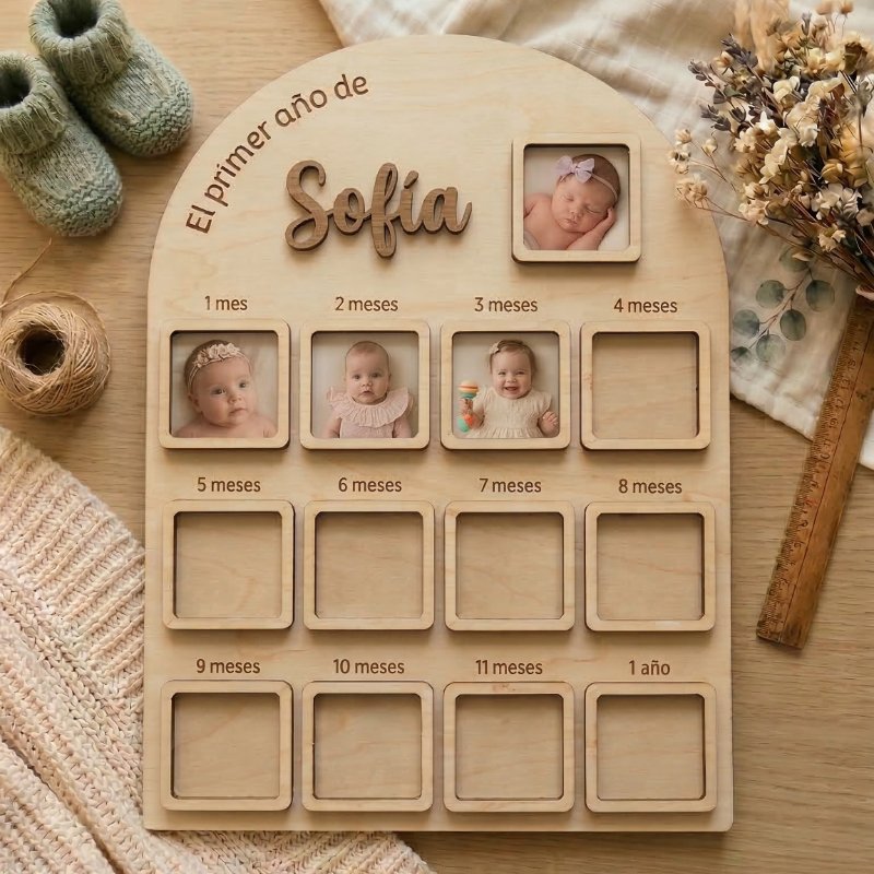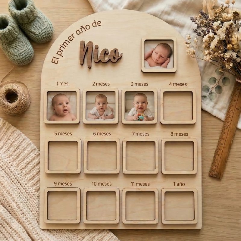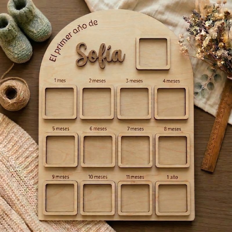 Me encargo personalmente de seleccionar las maderas y cuidar cada corte láser para que el acabado del marco de fotos primer año sea impecable: