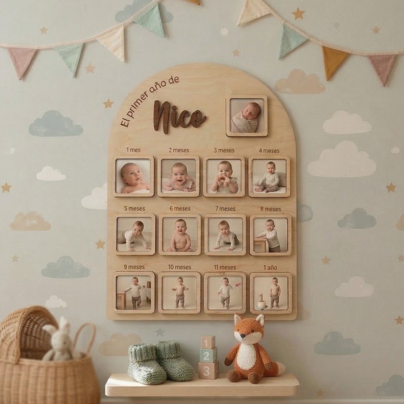 Si eres mamá o papá, este tablón será el rincón más tierno de su habitación. Y si estás buscando un regalo de recién nacido que realmente emocione, te aseguro que este detalle dejará sin palabras a los nuevos padres; es algo personal, útil y que conservarán para toda la vida. Este marco de fotos primer año también es perfecto como regalo para el primer cumpleaños del peque, ya que puedes enviarme las fotos y recibirlo con todas las fotos impresas y enmarcadas.